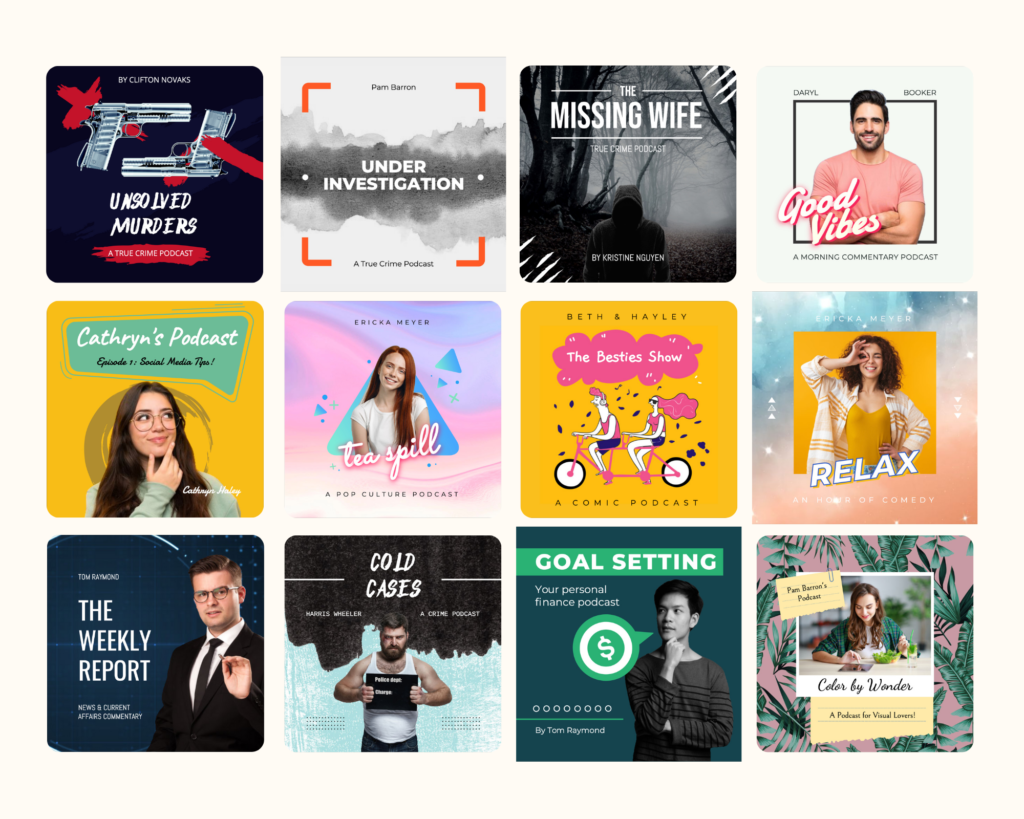 Comment faire, nous demanderez-vous ? Vous pouvez simplement vous rendre sur Designmaker et choisir l’un de nos modèles d’affiches de podcast prêts à l’emploi pour commencer à créer le thumbnail parfait. Assurez-vous de bien connaître le type de votre audience,par exemple, si la majorité de vos auditeurs sont des jeunes femmes – il faudrait dans ce cas là être en mesure de connaître les tendances visuelles qui seraient appréciées par ce segment, et d’intégrer ces éléments dans la couverture de votre podcast.